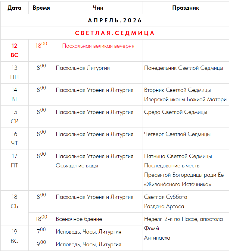13 ПН | 800 | Пасхальная Литургия | Понедельник Светлой Седмицы |