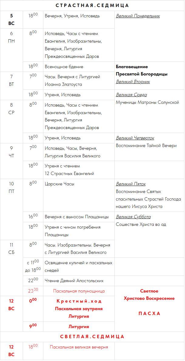 4 СБ | 800 | Исповедь, Часы, Литургия | |