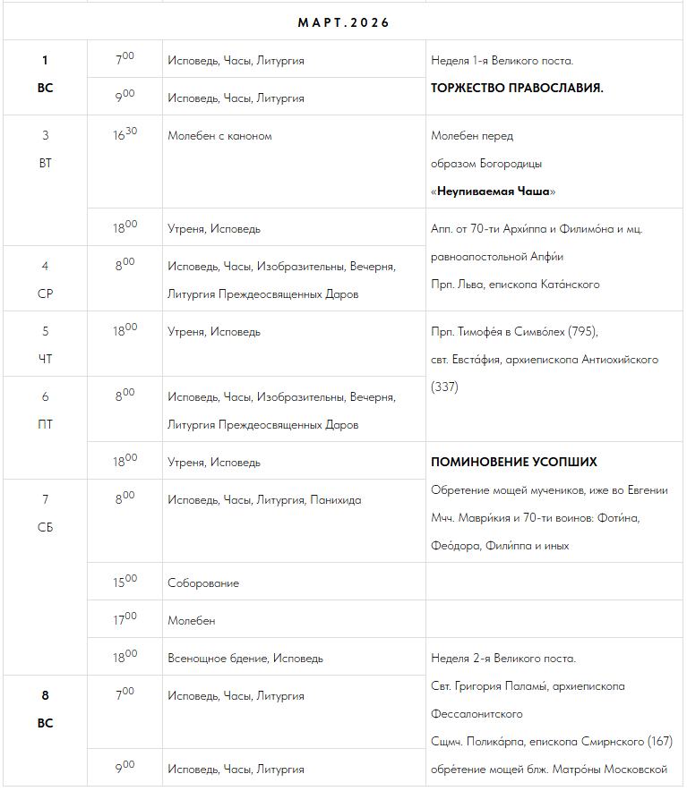 1 ВС | 700 | Исповедь, Часы, Литургия | Неделя 1-я Великого поста. ТОРЖЕСТВО ПРАВОСЛАВИЯ. |